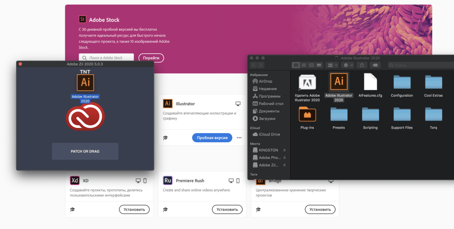 拖动 Adobe Photoshop 2020 应用程序到 Zii 的 PATCH OR DRAG处。
